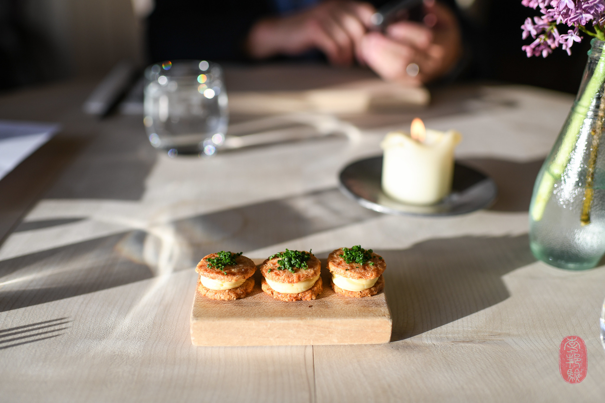 Anyone who has visited or read about Chez Panisse knows that Alice Waters started this restaurant to focus on seasonal and eco-friendly eating. (You can read more about the restaurant’s philosophy and history here.) As well, Waters and the restaurant’s co-founders wanted a place where they could “do things the way they would like them done at a dinner party at home.”The meal started out with an aperitif (offered on the Friday and Saturday dinner menus). On our night, it was a Kir. I don’t drink alcohol, so I was served a non-alcoholic Gewurtzraminer – a clear, bright grape juice from Germany. The Kir was accompanied by some